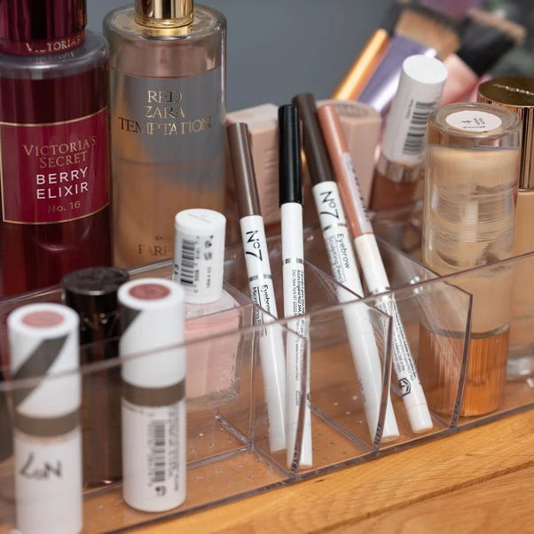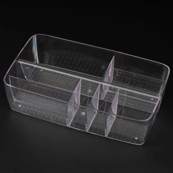 With eight compartments of varying sizes, this Addis Acrylic Large Organiser Tray is ideal for creating clutter free and tidy spaces in your home. Suitable for a range of uses including storing cosmetics, stationery or beauty products, this tray will ensure that whatever you need is easily accessible. Made from sturdy clear acrylic, keep it in tip top condition with the occasional wipe clean.