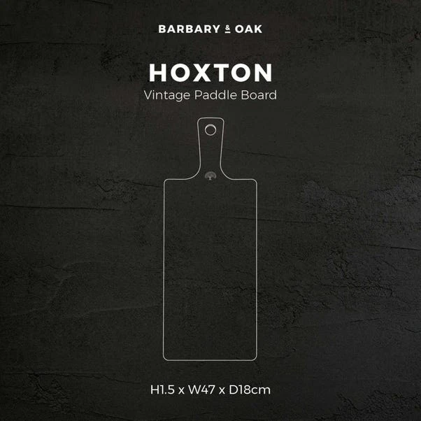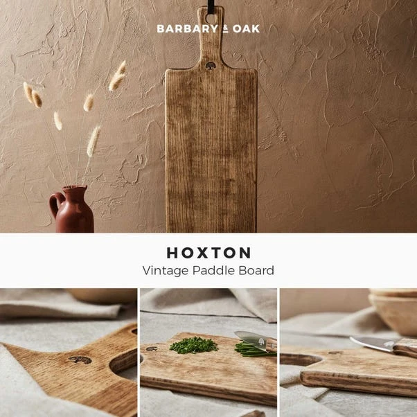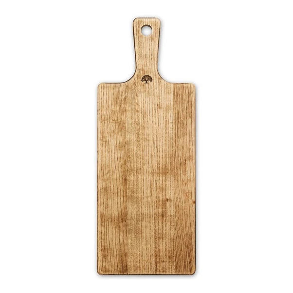 This is a wooden serving paddle board made from durable ash wood with a natural grain and rounded edges. Featuring a hanging hole that allows for easy storage, it is perfect for serving or presenting food items, such as cheese or bread.