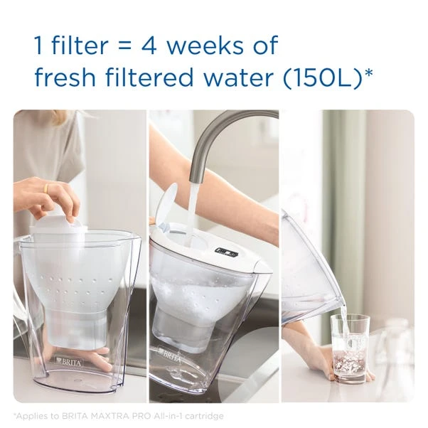 Introducing the BRITA Marella White MaxtraPro Annual Set – the ultimate water filter jug for a fresh and endless supply of tap water. Enjoy the convenience of the innovative 4-stage filtration system, powered by natural activated carbon and ion exchanger pearls, effectively removing impurities like herbicides, pesticides, and pharmaceuticals, all whilst reducing taste-impairing chlorine, lead, and copper.
