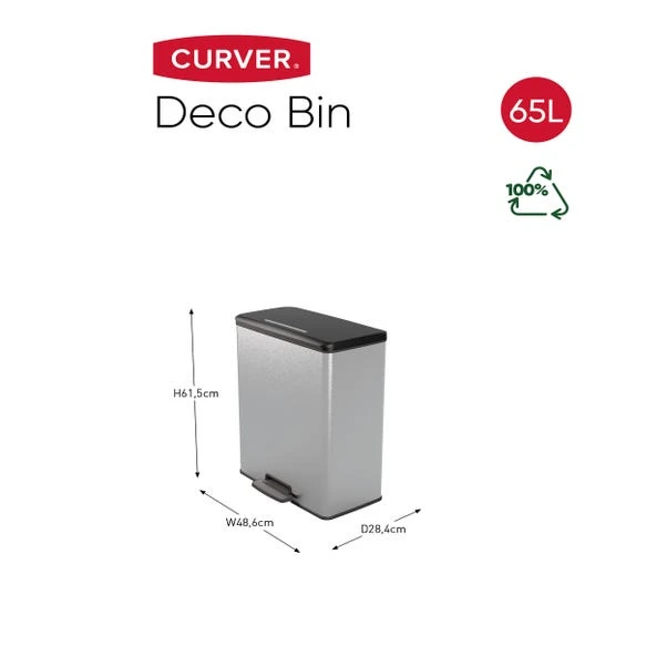 Add a touch of sleek style to your home with the Curver Deco Bin 65L in silver. Featuring a large opening for effortless filling and emptying, this bin is designed with a convenient bag liner holder to keep everything neatly in place. The pedal touch opening mechanism offers easy, hands-free access, while the contemporary metal-look exterior is made from durable plastic—ensuring it’s free from fingerprints, rust, and dents. Made from high-quality resin, it’s easy to wipe clean, making it both practical and low-maintenance. Ideal for any modern home, this bin combines style and convenience in one. Keep your space tidy with a bin that looks as good as it works.