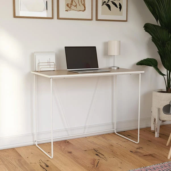 Elevate your productivity and inspire creativity with the minimalistic design of the Dante Computer Desk. With its playful angles and elegant restrained silhouettes of matte white on natural woodgrain, this desk creates a light and airy feel that’s never overdone. Made from durable engineered wood and powder-coated metal, it combines style and affordability, giving you the best of both worlds.