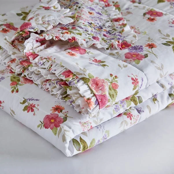 Embrace the charm of countryside flower meadows with this colourful floral print bedding range, designed to bring the beauty of nature into your bedroom. Crafted from luxurious 100% cotton sateen with a crisp white background and a 300 thread count, this versatile bedspread features delicate quilting and a ruffle edge for added elegance. Complete the look with matching bedding, curtains, and pillow sham to create a cohesive ambiance in your sanctuary. Coordinate effortlessly with the coordinating print reverse, available in two sizes for the perfect fit. Good things come to those who coordinate, so why not elevate your bedroom decor with this exquisite ensemble?