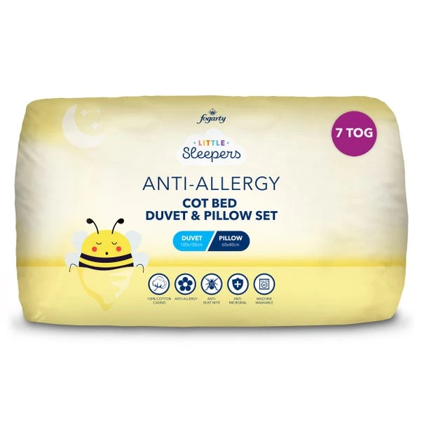 The Fogarty Little Sleepers 7 Tog Duvet and Pillow Set is designed to keep your little one warm and comfortable throughout the night. With a soft polyester fibre filling and a naturally breathable 100% cotton cover, this set provides protection against allergens for a healthier sleeping environment. The cosy 7 tog rating makes it perfect for cooler nights, while its durable materials are machine washable and tumble dryer safe for effortless cleaning. A practical and snug addition to your child’s bedtime essentials.