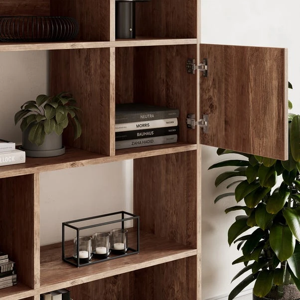 Designed with a straight edge finish, this stylish bookcase features six open shelves and two square cupboards, complete with adjustable hinged doors.