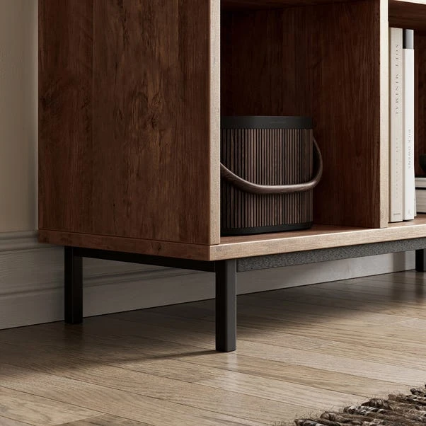 Inspired by contemporary and simplistic styling the Fulton range is a perfect statement piece to any living space. Made from durable materials with a metal tube base and unique matt finish, this self-assembly range features a rustic pine-effect finish with complementing black handles.