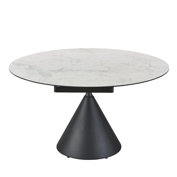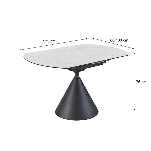 This well-balanced dining set brings together sculptural design and smart practicality. The round ceramic tabletop showcases a marble-effect finish, supported by a bold conical base that adds presence without overpowering the room. The real showpiece, though, is the smooth extension function that expands the table from 80cm to 130cm, offering flexibility for guests or larger meals. It’s paired with four aura chairs, upholstered for comfort and subtly curved for a relaxed feel.