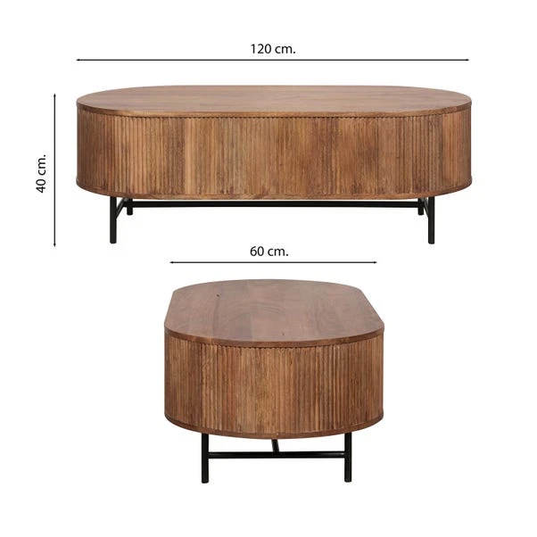This Indus Valley Zen Coffee Table showcases a sleek Zen oval shape crafted with a ribbed design and supported by black iron legs.