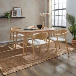 Designed to comfortably seat up to 6 people, the dining table effortlessly adapts to your needs, expanding when required while maintaining a sleek profile to save space in your dining area. Its warm and inviting wood finish complements various décor styles, making it an excellent choice for everyday dining or special gatherings. The dining chairs boast a distinctive curved back detail paired with an inviting ivory boucle seat, creating a sense of opulence and luxury. The stained wooden frame adds a touch of sophistication, making it a perfect addition to your dining space.
