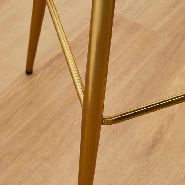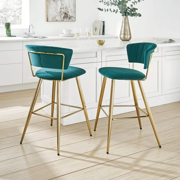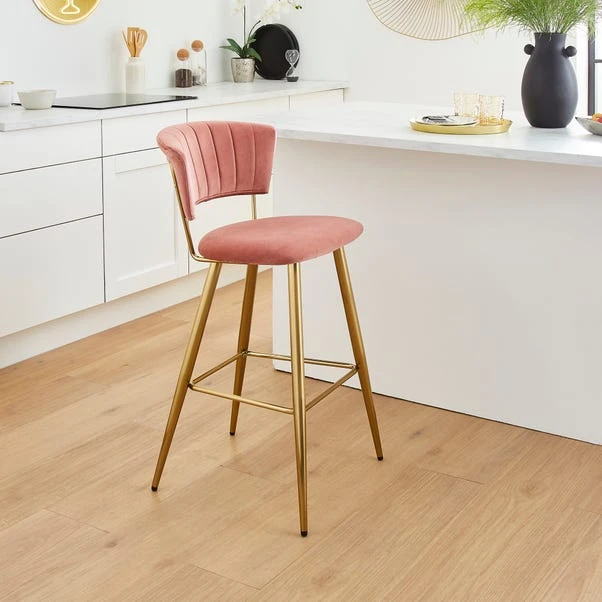 Finished in a plush velvet in a choice of stunning colours to match our Kendall chair, this bar stool boasts a contemporary luxe design. This stylish bar stool is crafted with a pleated, curved shell back and gold-finished metal legs to add a modern touch to your kitchen area.