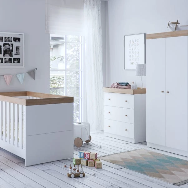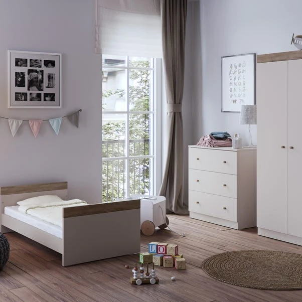 This Burlington cot bed from Little Acorns showcases stylish and modern Scandinavian-inspired designs, accentuated by attractive oak accents. Suitable from birth to approximately 4 years, it effortlessly converts to a toddler bed, offers three adjustable mattress heights, and requires a mattress size of 140 x 70cm (not included).