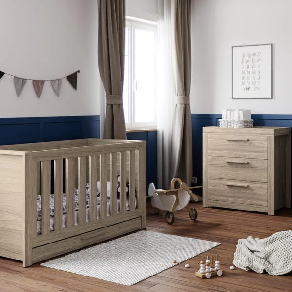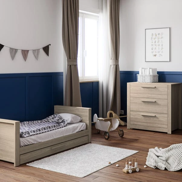 The Little Acorns Ellesmere Cot Bed and 3 Drawer Chest Nursery Set boasts a contemporary design with subtle grey and brown tones that blend well with any nursery decor. The cot bed offers three mattress height positions and converts into a toddler bed. The robust dresser, initially a changing unit, features three deep drawers reinforced with metal bars for added durability, seamlessly converting into a chest of drawers as your child grows.