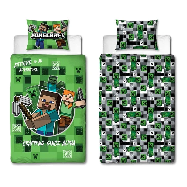 Dive into the world of Minecraft with this reversible duvet cover and pillowcase set. Perfect for any Minecraft enthusiast, it features a vibrant block check design. Made from a cotton-polyester blend, this set is both soft and durable. The popper closing ensures easy removal and washing. Both the duvet cover and pillowcase are machine washable and tumble dryer safe at a low temperature, making it a practical and fun addition to any single bed.