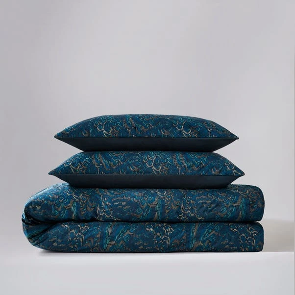 This Moorland Plume printed duvet cover and pillowcase set design is part of our Natural History Museum collection. The duvet cover set features moorland plume feathers all over the bedding set in stunning shades of blues and greens. The feathers have been inspired by the Snipe, a beautiful bird that can be found in moorland settings. Made from soft and cosy polyester and finished with secure button closure to give you an uninterrupted night sleep. This bedding set comes with matching pillowcases for a complete look and is available in a range of bedding sizes.