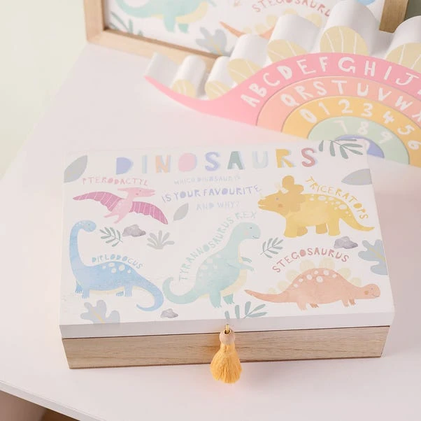 This gorgeous dinosaur themed keepsake box from Petit Cheri brings fun and learning to any child’s space whilst keeping treasured items safe. The hinged lid features multicoloured dinosaur decorations along with dinosaur names to learn and the question, ‘Which dinosaur is your favourite and why?’. The tassel at the front makes opening the lid easy and the sturdy wooden construction is built to last.