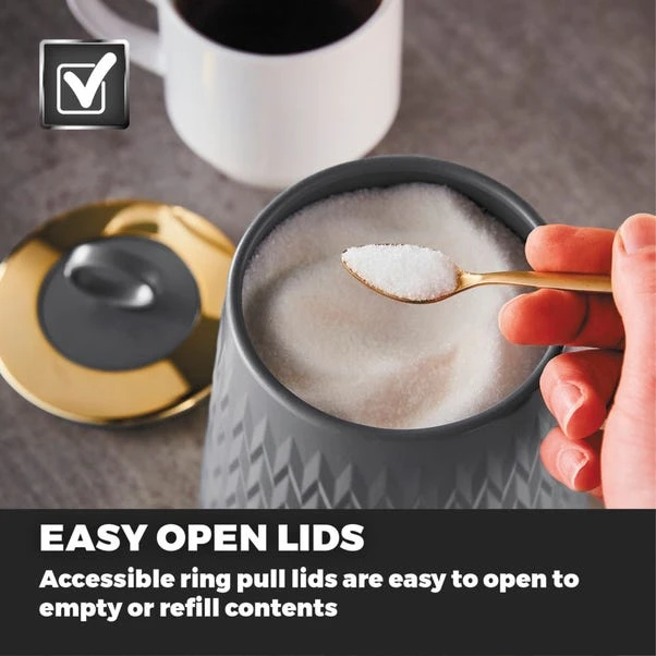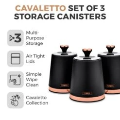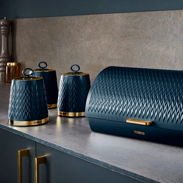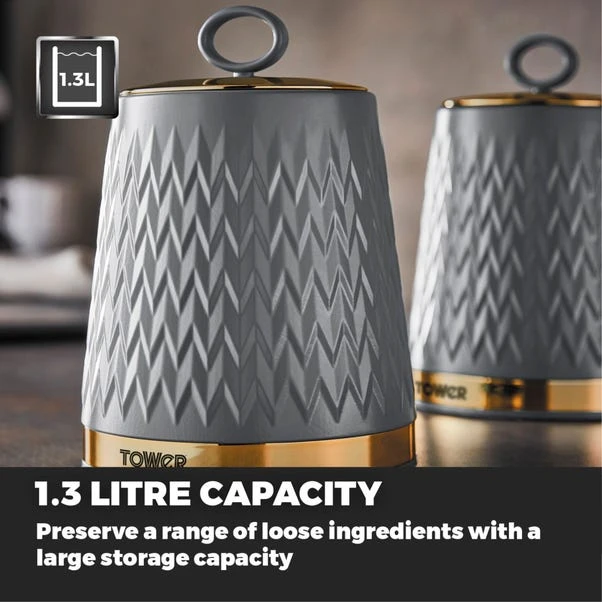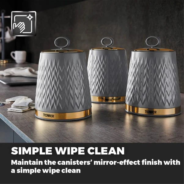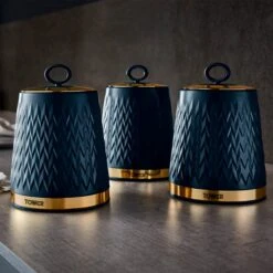 Add style and functionality to your kitchen worktop with this set of 3 kitchen storage canisters that are round in shape, with a mirror finish lid and a handy round loop on the lid for easy access and opening. They feature a textured raised pattern, polished bronze colour accents and each canister has a capacity of approximately 1.3 liters. The set is available in three different colours: black, grey, and midnight blue.