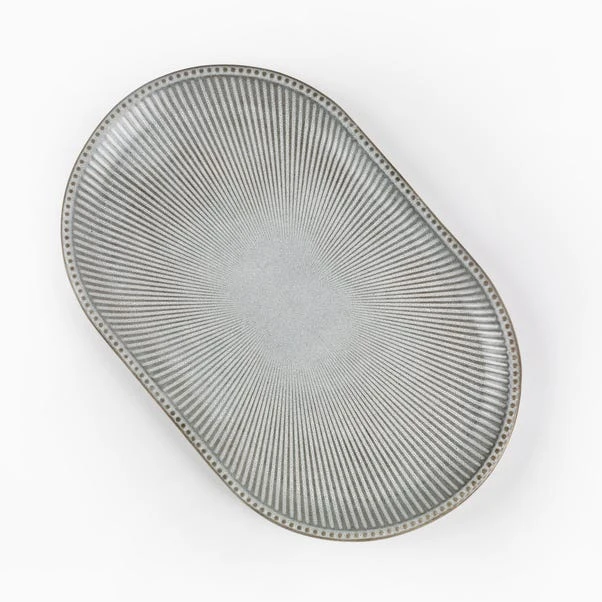 Serve in style with the Steeple Embossed Oval Platter, made from durable stoneware. Its refined grey reactive glaze and intricate embossed design bring a sophisticated touch to any table. The versatile oval shape is perfect for presenting mains, starters, or desserts, seamlessly fitting into any dining occasion. While dishwasher safe, handwashing is recommended to preserve its elegance. Ideal for both everyday use and special events, this platter is a must-have addition to your collection, with other matching items available in the Steeple range.