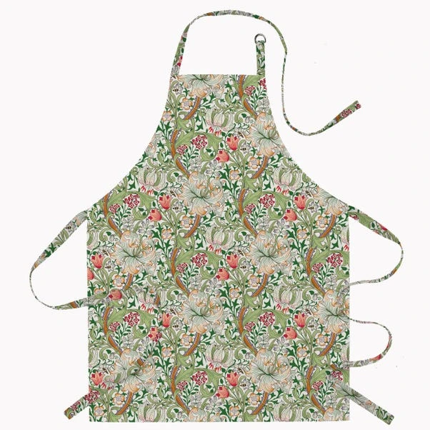 The William Morris Golden Lily apron provides a stylish and practical addition to your kitchen attire. Embrace the charm of our elegant entwined lily stem and tendrils floral design, adding a touch of elegance to your cooking routine. The adjustable collar ensures a comfortable fit, while the waist ties provide a secure and customisable closure. Made from 100% cotton with an acrylic coating which is easy to wipe clean, so don’t worry about the pasta sauce splatters, simply wipe clean with a damp cloth.