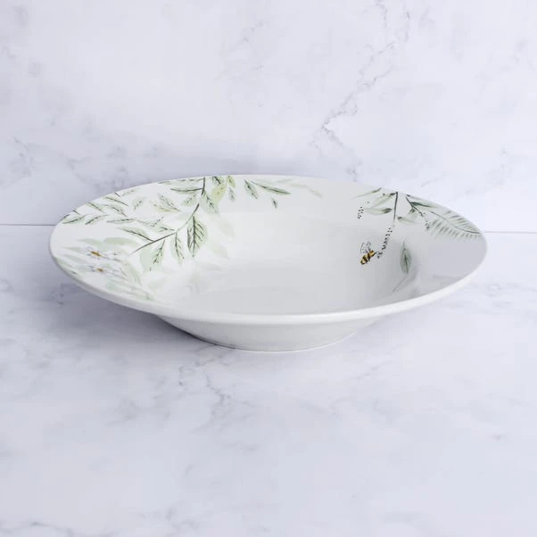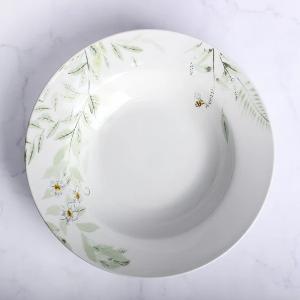 Serve your favorite pasta dishes in style with the Willow Trail Sage Gloss Porcelain Pasta Bowl. This bowl features a beautiful floral leaf and bee design in soft sage on a white base, adding natural charm to your meals. Made from porcelain, it pairs perfectly with matching plates, cereal bowls, mugs, and dinner sets available separately.